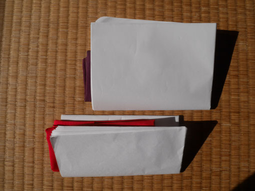 Kaichū-shi - paper 'envelope' for the inside pocket of kimono. Used to store all the other items except the fan and incense pouch. For men, the kaichū-shi is made from nine sheets of hanshi paper folded into quarters. For women, the kaichū-shi is made from seven sheets of hanshi paper, folded into half, then into thirds.