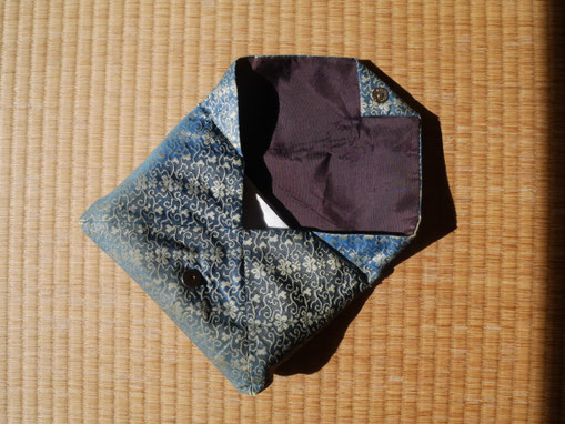 A cloth carry wallet for kaishi paper, fukusa (purifying cloth), fan and other items. Kaishiire differ for men and women. Also called 'fukusa-basami' or 'sukiya-bukuro'.